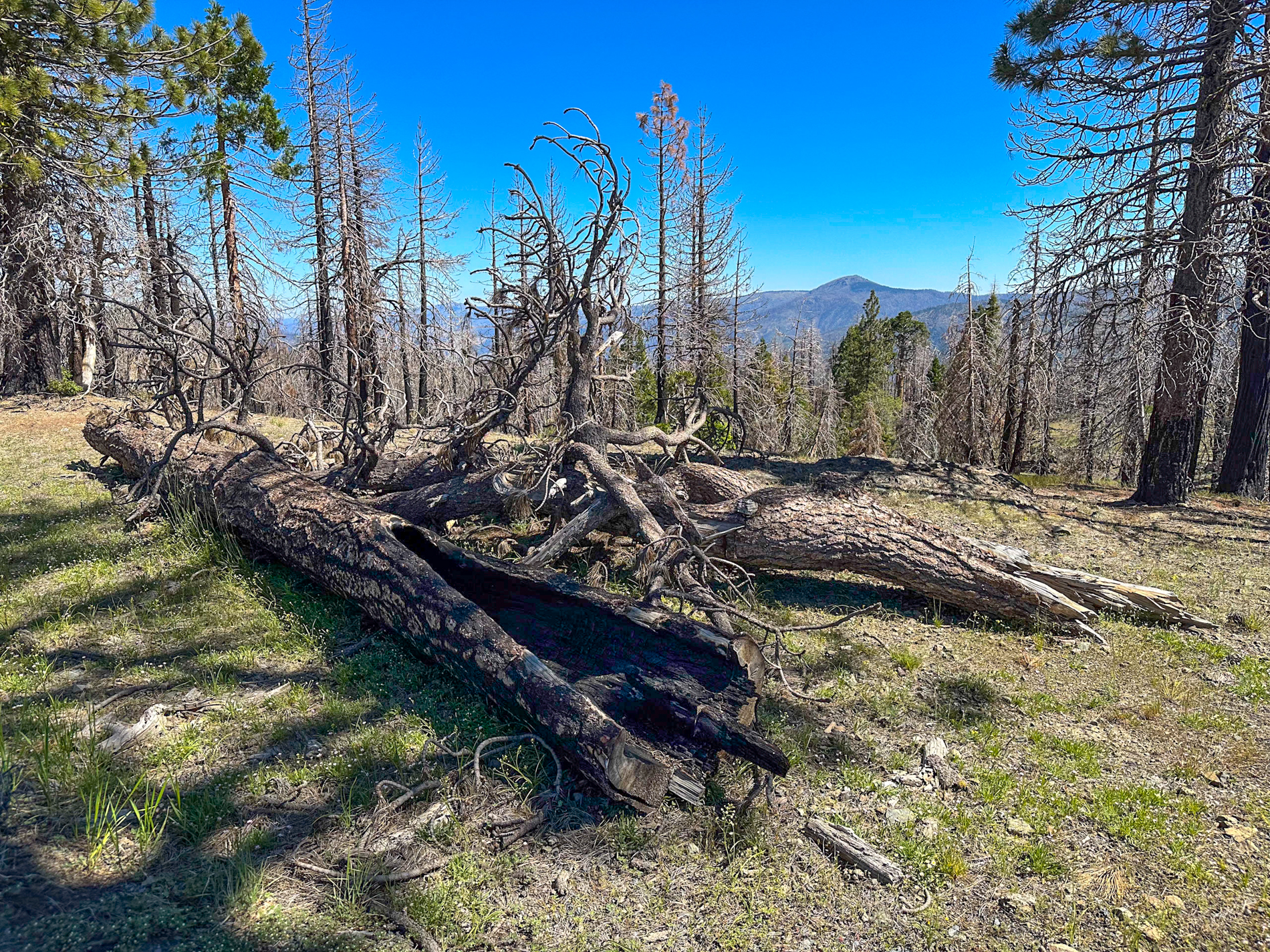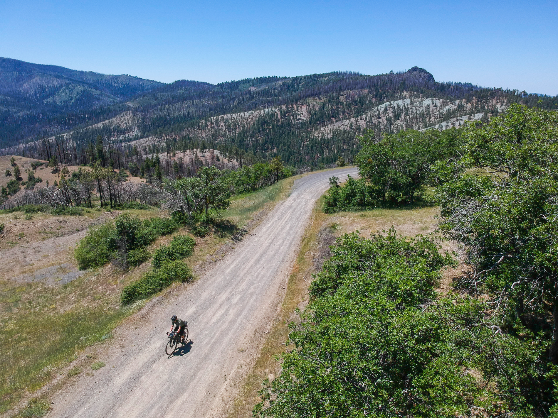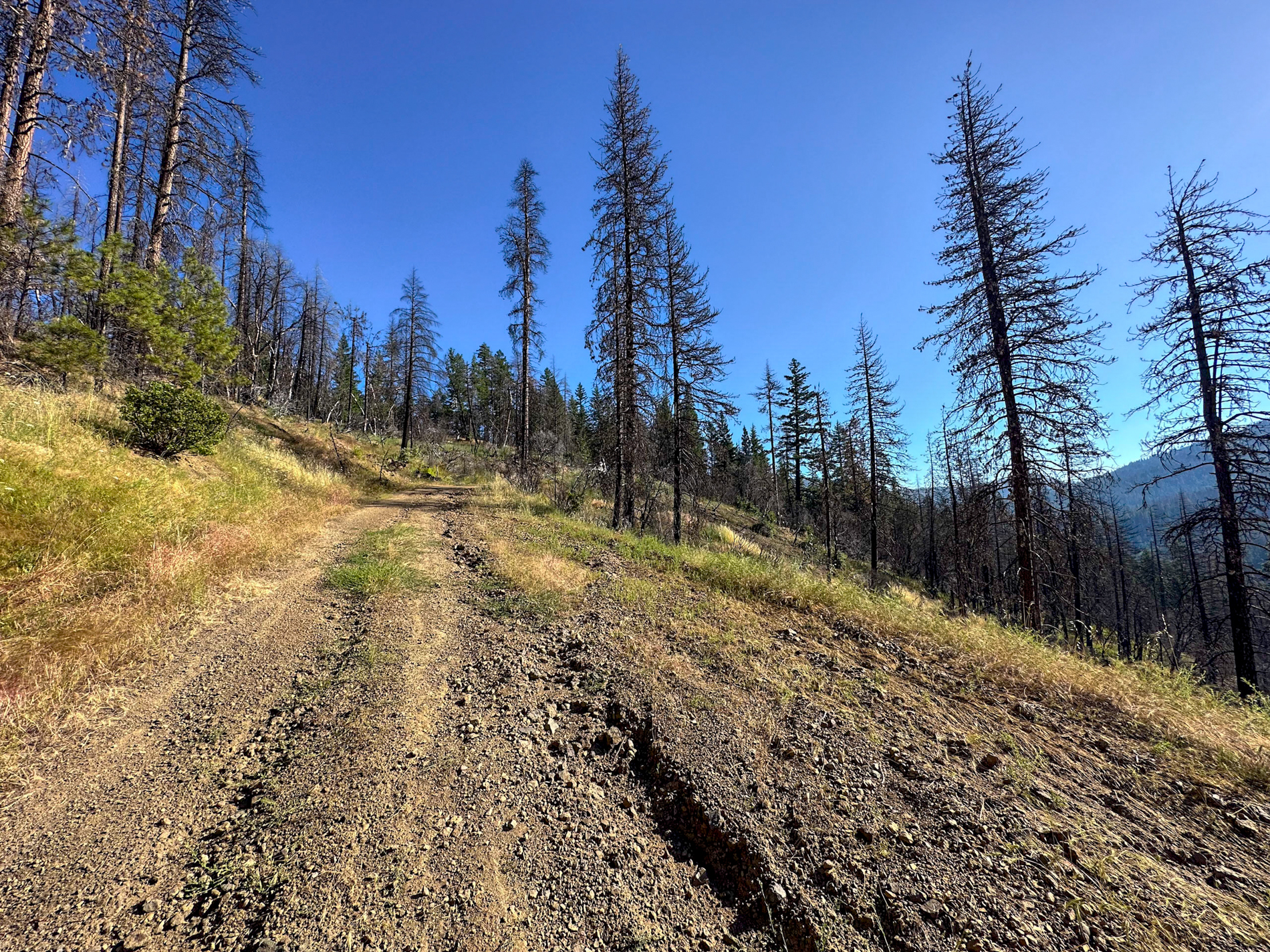 The US Forest Service website states that “nearly 90% of the Mendocino National Forest has burned within the last four years” due to various large-scale fire activities, namely the Mendocino Complex Fire (2018), burning the southern half of the forest, and the August Complex Fire (2020), burning the northern half. In practice, this meant I was about to cycle through vast landscapes of blackened and scorched trees and thus providing little to no shade on the pass road and elsewhere along the route.