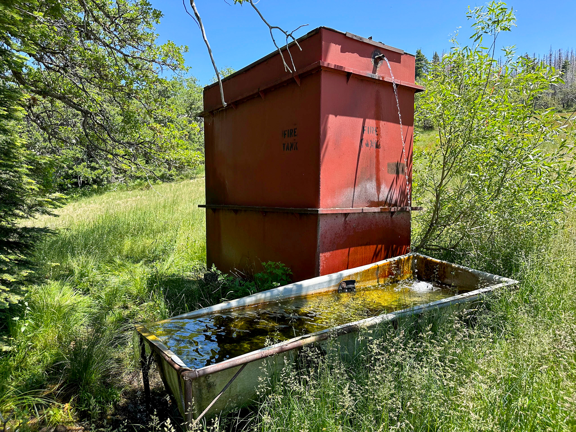 Hydration was crucial, and I had extended my water-carrying capacity on the bike to close to 1.25 gallons just before the trip. I encountered a couple of streams flowing down the hillside as I climbed. About an hour before reaching the high point, I came across a water tank in a small meadow on the north side of the road, the faucet constantly spewing water into a trough. A perfect place to take rest and refill my water bottles.